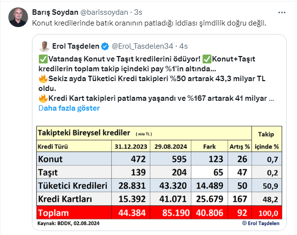 Ekonomist Barış Soydan, https://x.com/barissoydan X sosyal medya hesabından yaptığı paylaşımda, BDDK verilerine göre, konut kredilerinde batık oranının patladığı iddası şimdilik doğru değil dedi.