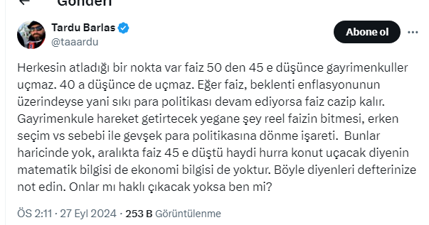 Tardu Barlas, sosyal medya hesabı X'ten kredilerin düşmesiyle konut fiyatlarının fırlayacağını söyleyenlere tokat gibi yanıt verdi. Barlas, ''faiz 50'den 45'e düşünce gayrimenkuller uçmaz. 40'a düşünce de uçmaz. Eğer faiz, beklenti enflasyonunun üzerindeyse yani sıkı para politikası devam ediyorsa faiz cazip kalır.'' dedi ve fiyatların yükseleceğini söyleyenler için ''matematik bilgisi de ekonomi bilgisi de yoktur.'' dedi.