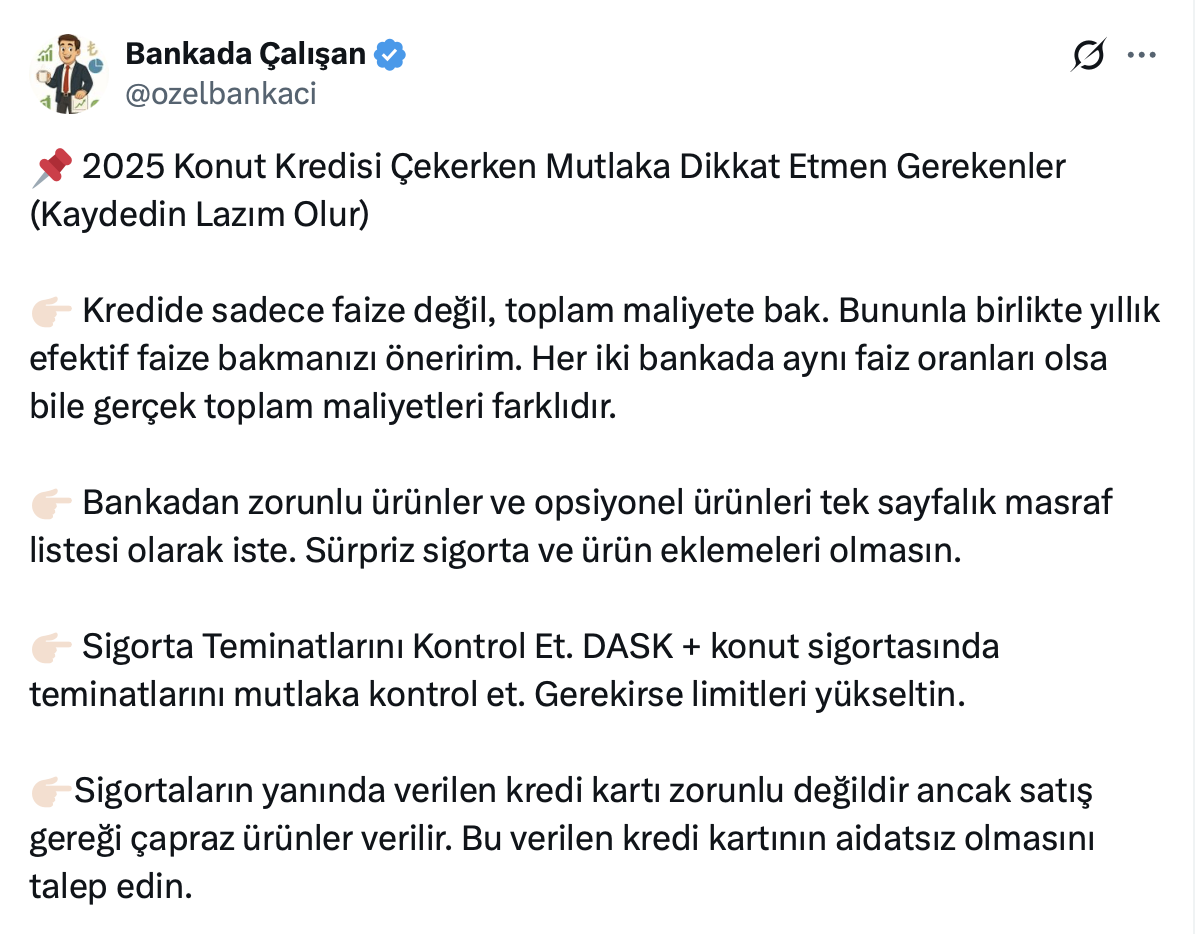 Konut kredisi faiz oranları son günlerin en çok konuşulan konuları arasında yer alırken, 14,1 bin takipçili Bankada Çalışan isimli kullanıcı resmi sosyal medya hesabı https://x.com/ozelbankaci üzerinden yaptığı paylaşımda konut kredisi çekerken dikkat edilmesi gerekenleri açıkladı.