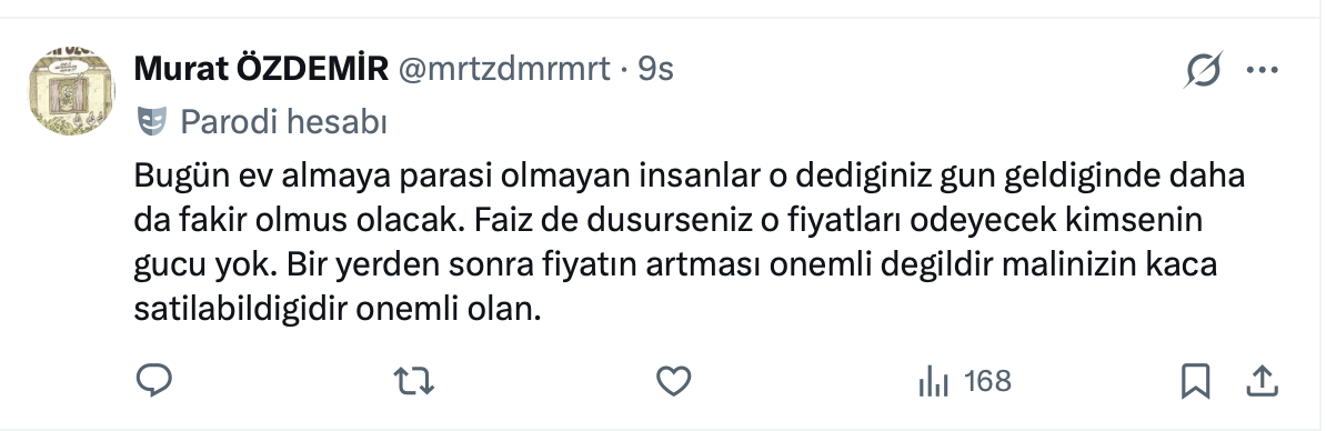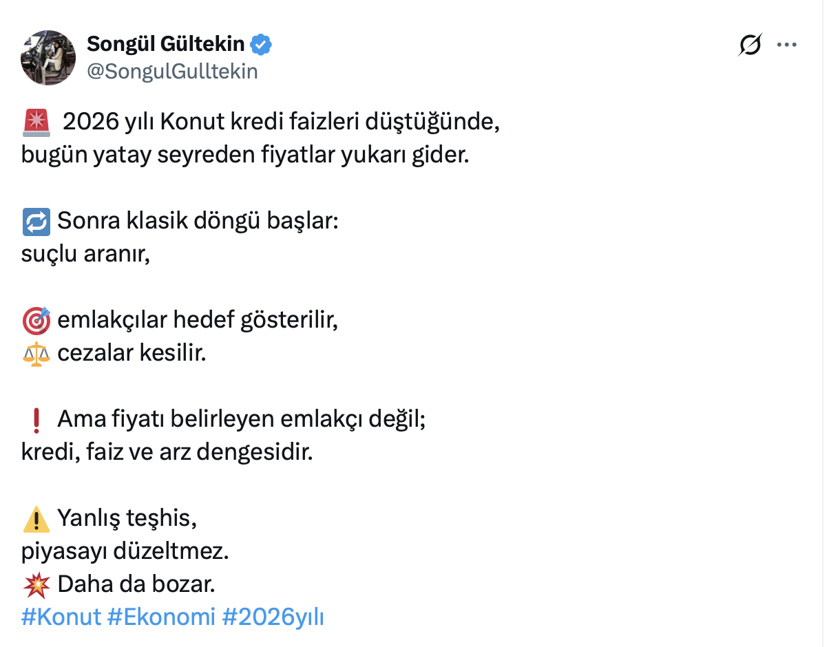 Gayrimenkul Uzmanı Songül Gültekin, resmi sosyal medya hesabı https://x.com/SongulGulltekin üzerinden yaptığı paylaşımda 2026 yılında konut kredisi faizleri düştüğünde yatay seyreden konut fiyatlarının yukarı gideceğini belirtti.