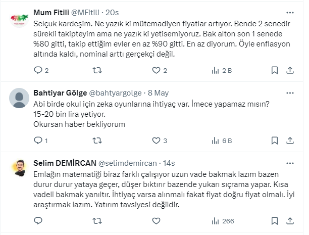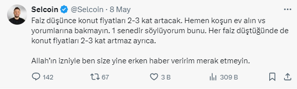 Milyonlar, ev sahibi olabilmenin yollarını ararken Piyasa Analisti Selçuk Ergin (Selcoin) sosyal medya hesabından çarpıcı açıklamalarda bulundu. Ergin, faiz düşünce konut fiyatlarının 2-3 kat artacağına dair söylentilerin doğru olmadığını, 'hemen koşun ev alın' yorumu yapanları dikkate almamaları konusunda uyardı.