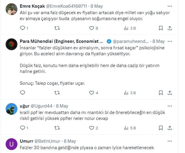 Faiz düşünce konut fiyatları 2-3 kat artacak. Hemen koşun ev alın vs yorumlarına bakmayın. 1 senedir söylüyorum bunu. Her faiz düştüğünde de konut fiyatları 2-3 kat artmaz ayrıca.