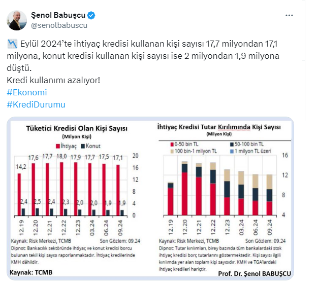 “Eylül 2024’te ihtiyaç kredisi kullanan kişi sayısı 17,7 milyondan 17,1 milyona, konut kredisi kullanan kişi sayısı ise 2 milyondan 1,9 milyona düştü. Kredi kullanımı azalıyor!