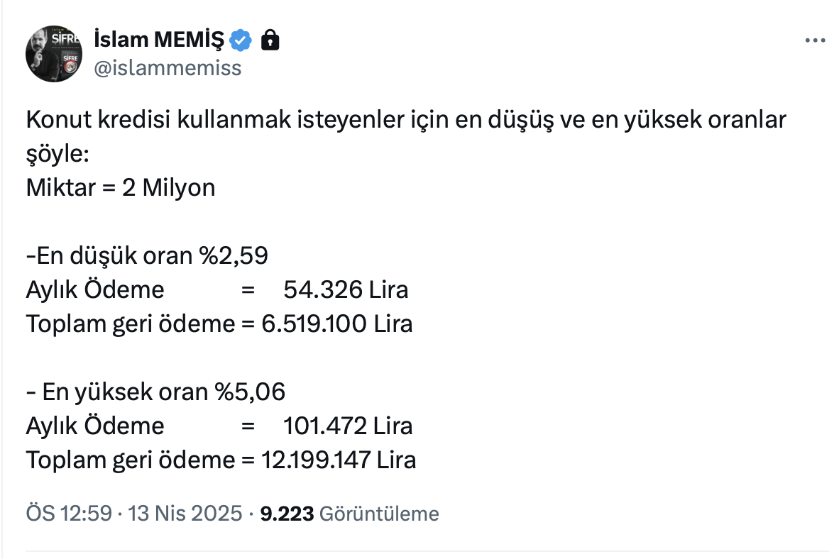 Vatandaşlar “en uygun kredi” ile ilgili araştırmalar yaparken, Altın ve Para Piyasaları Uzmanı İslam Memiş’ten de konut kredileri ile ilgili bir paylaşım geldi.
