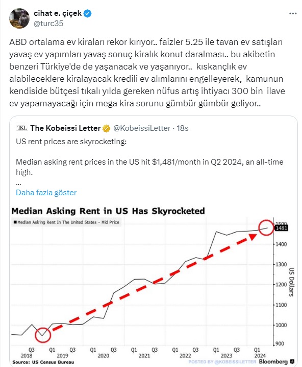 ABD ortalama ev kiraları rekor kırıyor.. faizler 5.25 ile tavan ev satışları yavaş ev yapımları yavaş sonuç kiralık konut daralması.. bu akibetin benzeri Türkiye'de de yaşanacak ve yaşanıyor.. kıskançlık ev alabileceklere kiralayacak kredili ev alımlarını engelleyerek, kamunun kendiside bütçesi tıkalı yılda gereken nüfus artış ihtiyacı 300 bin ilave ev yapamayacağı için mega kira sorunu gümbür gümbür geliyor..