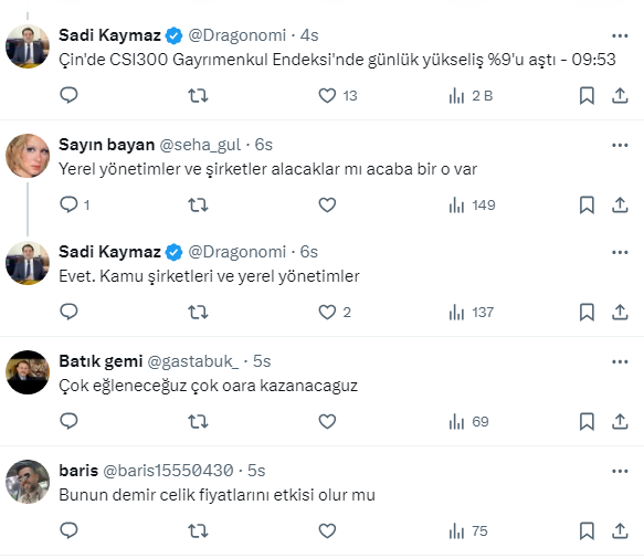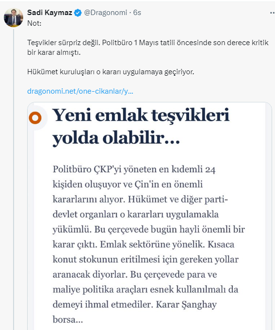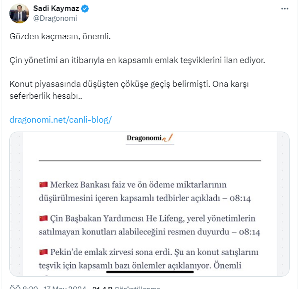 Çin, emlak krizini aşmak için önemli kararları hayata geçirmeye başladı. Bunlardan en önemlisi konut kredisi faizlerindeki taban kaldırıldı ve bireysel alıcılar için minimum peşinat oranları düşürüldü. Öte yandan Uuygun fiyatlı konutlar için yeniden kredi imkanı faiz oranı yüzde 1,75 olacak. Bloomberg HT Pekin Temsilcisi Sadi Kaymaz sosyal medya hesabından Çin'deki bu emlak teşviklerini 'Gözden kaçmasın önemli'' diyerek duyurdu. Kaymaz, sosyal medya hesabı X'ten Çin'in konut piyasasındaki hareketliliğine dikkat çekerek önemli açıklamalarda bulundu. İşte o açıklama ve gelen yorumlar...