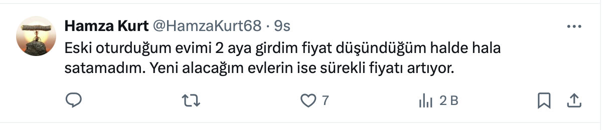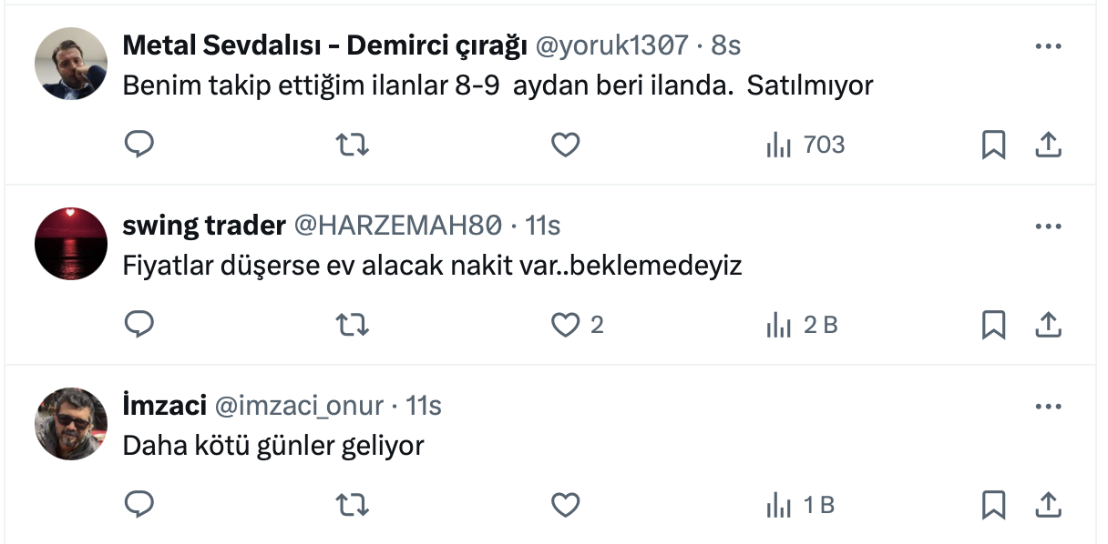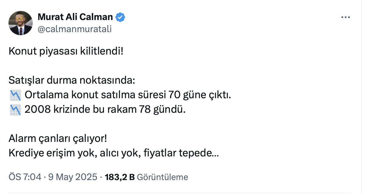 Murat Ali Calman paylaşımında konut piyasasının kilitlendiğini belirterek, ortalama konut satılma süresinin 70 güne çıktığını belirtti.