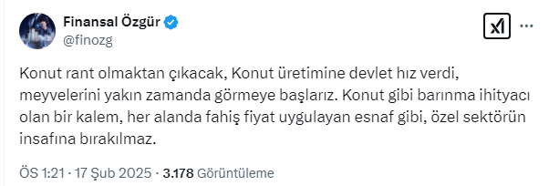 Finansal özgür, konut üretiminin bu projeyle artacağını ve fahiş rakamların son bulacağını belirtti. İşte Finansal Özgür'ün sosyal medya hesabı X'ten yaptığı o paylaşım ve gelen yorumlar...