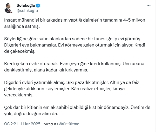 Finansal Analist Solakoğlu sosyal medya hesabından emlak piyasasıyla ilgili çarpıcı açıklamalarda bulundu. Solakoğlu, çok az bir kesimin emlak sahibi olduğunu ve üretimin olmadığını söyledi.