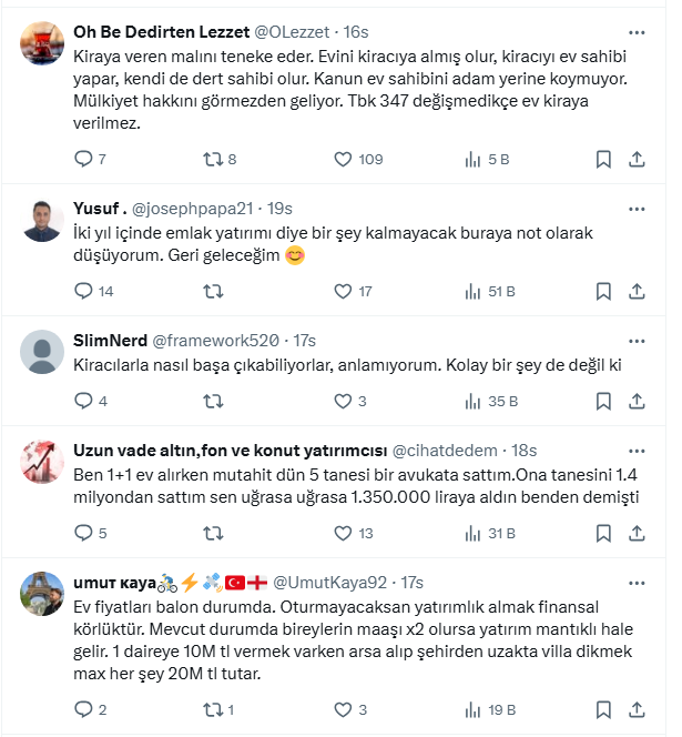 Diğerleri evleri yatırımlık almış. Sıkı pazarlık etmişler. Altın ya da faiz gelirleriyle aldıklarını söylemişler. Kârı realize etmişler, kiraya vereceklermiş.