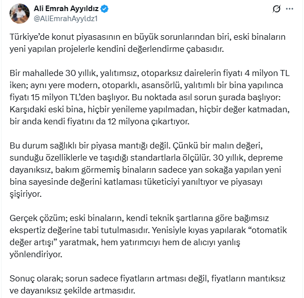 Bu durum sağlıklı bir piyasa mantığı değil. Çünkü bir malın değeri, sunduğu özelliklerle ve taşıdığı standartlarla ölçülür. 30 yıllık, depreme dayanıksız, bakım görmemiş binaların sadece yan sokağa yapılan yeni bina sayesinde değerini katlaması tüketiciyi yanıltıyor ve piyasayı şişiriyor.