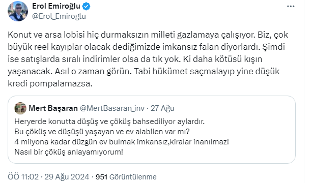 Gazeteci Emiroğlu, sosyal medya hesabı X'ten yaptığı paylaşımda, konut piyasasında daha kötüsünün kışın yaşanacağını belirterek kara haberi duyurdu. İşte Gazeteci Erol Emiroğlu'un o paylaşımı....