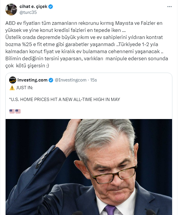 Çiçek, ABD'de ev fiyatlarının tüm zamanların rekorunu kırdığını ve bunun konut kredisi faizlerinin en tepedeyken gerçekleştiğini belirtti. Çiçek, ABD konut verileri ile Türkiye'deki konut satışlarını kıyaslayarak ''Türkiyede 1-2 yıla kalmadan konut fiyat ve kiralık ev bulamama cehennemi yaşanacak'' dedi. İşte o paylaşım ve gelen yorumlar...