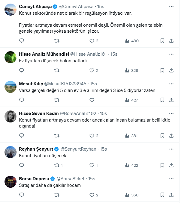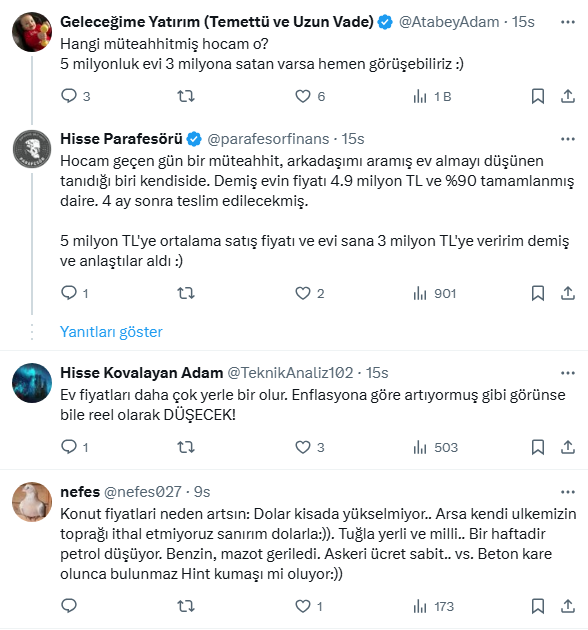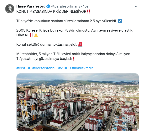 Sosyal meyda hesabı X'ten paylaşım yapan Hisse Parafesörü isimli analist, konut piyasasında krizin derinleştiğini söyleyerek, konutların ilanda kalma süresinin arttığına dikkat çekti. 2008 küresel krizine dikkat çeken analist, bu yıllarda bile konutların ilanda kalma süresinin 78 gün olduğunu söyleyerek uyardı.