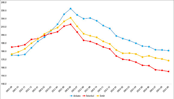 Ağustos’tan Eylül’e reel konut fiyat endeksi İstanbul’da 1,3 puan, Ankara’da 0,8 puan, İzmir’de ise 1,9 puan azaldı. Eylül’de reel konut fiyat endeksi İstanbul’da 155,3, Ankara’da 180,9, İzmir’de ise 168,7 oldu.