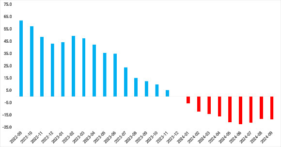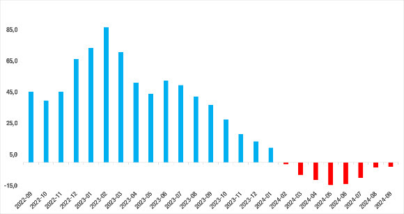 Eylül 2024’te yıllık fiyat değişimi oranı Ağustos 2024’e kıyasla 0,3 puan azalarak yüzde -18,6 ile negatif değerlerde seyrini sürdürdü.