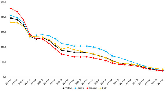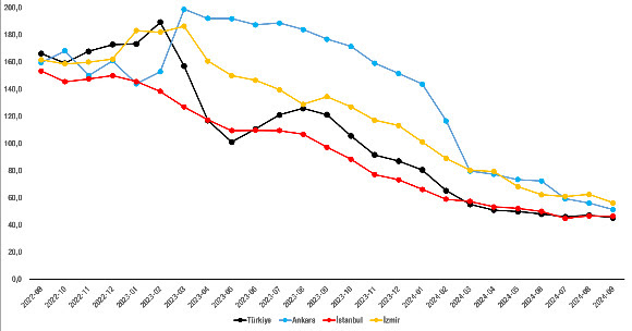 Eylül ayı itibarıyla düşüş devam etmektedir. Ağustos 2024’te yüzde 47,1 olan kira fiyatlarının yıllık değişim oranı Eylül 2024’te yüzde 45,2 oldu.
