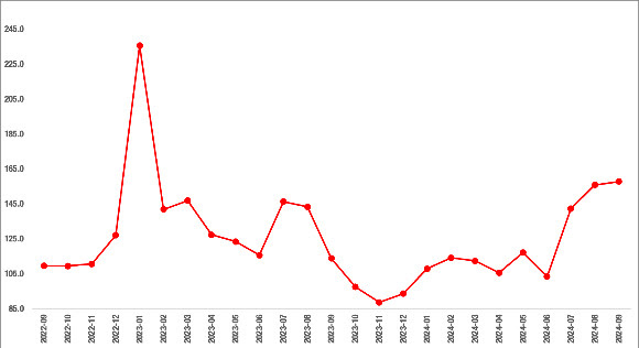 Aralık 2023’ten itibaren yönünü yukarı çeviren endeks, Ağustos’tan Eylül’e yüzde 1,2’lik bir artışla 157,8’e ulaşmıştır. Geçen yılın Eylül ayına kıyasla endeks yüzde 38,6 daha yüksek.