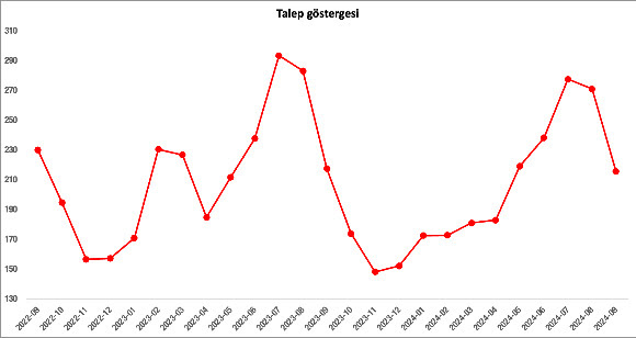 2023 Ocak’ta istisnai bir yükselişle 235’e ulaşan talep endeksi, Şubat 2023 depreminin ardından aşağı yönlü bir seyir izleyerek Kasım 2023’te 88,7’ye kadar geriledi.