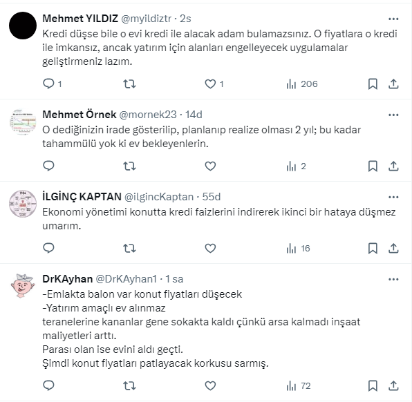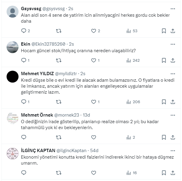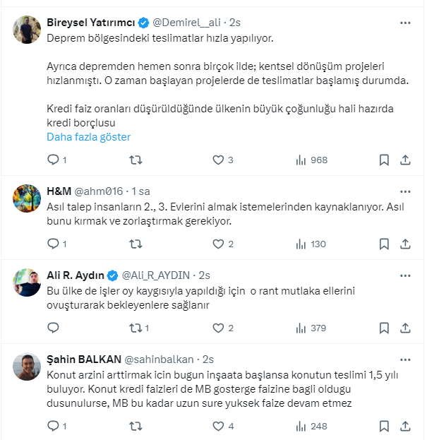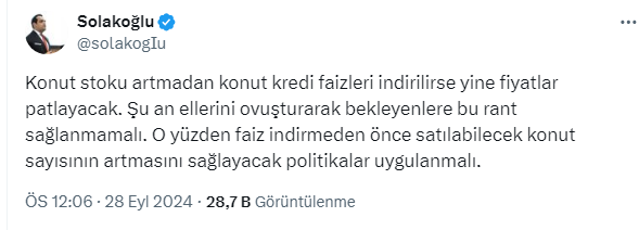 Analist Solakoğlu, sosyal meyda hesabı X'ten piyasadaki yanlış politikadan bahsetti. Solakoğlu, ''Konut stoku artmadan konut kredi faizleri indirilirse yine fiyatlar patlayacak.'' dedi. Bundan dolayı faiz indirmeden önce satılabilecek konut sayısının artmasını sağlayacak politikalar uygulanması gerektiğine dikkat çekti.