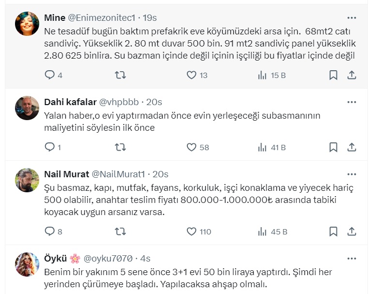 Yapılan paylaşımda, İstanbul'da 500 bin TL'ye 100 metrekare 3+1 ev yaptıran içerik üreticisi detaylardan bahsetti. Prefabrik ev yaptırdığından bahseden içerik üreticisi, duvarları strafor yerine taş yünü yaptırdığını da paylaştı.