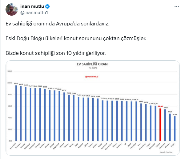 İktisatçı İnan Mutlu, sosyal medya hesabından ev sahipliği oranındaki düşüşe dikkat çekerek ''Ev sahipliği oranında Avrupa'da sonlardayız.'' dedi.