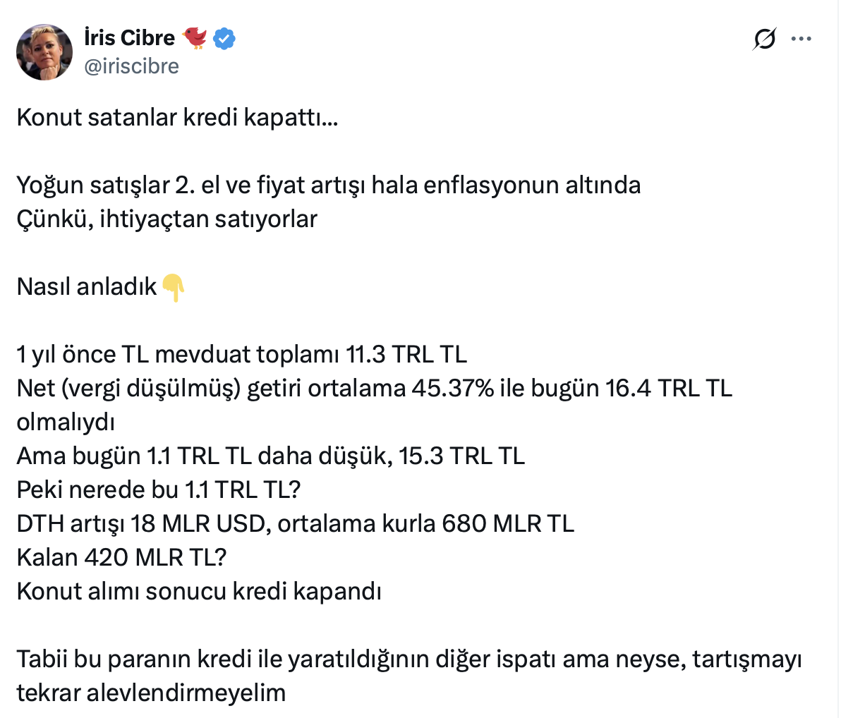 Konut satışları son günlerin en çok konuşulan konuları arasında yer alırken, Ekonomist İris Cibre resmi X hesabı https://x.com/iriscibre üzerinden yaptığı paylaşımda konut satanların kredi kapattığını belirtti.