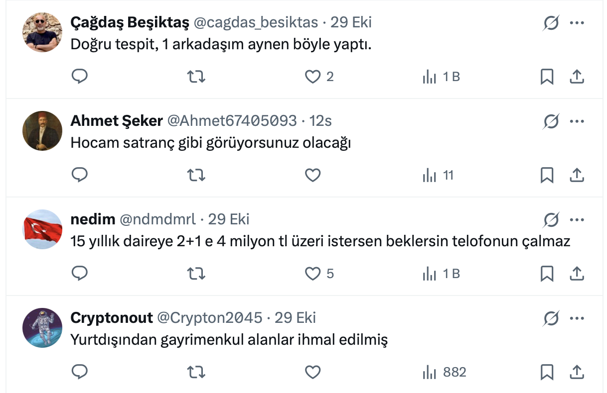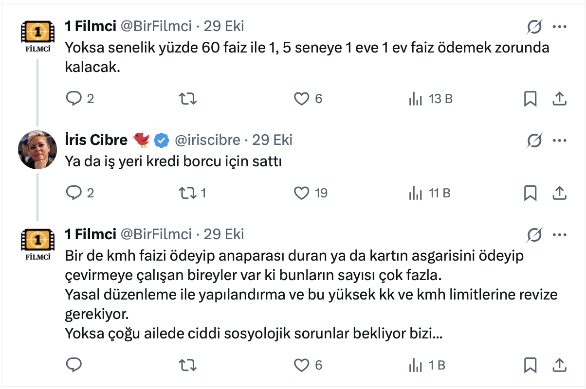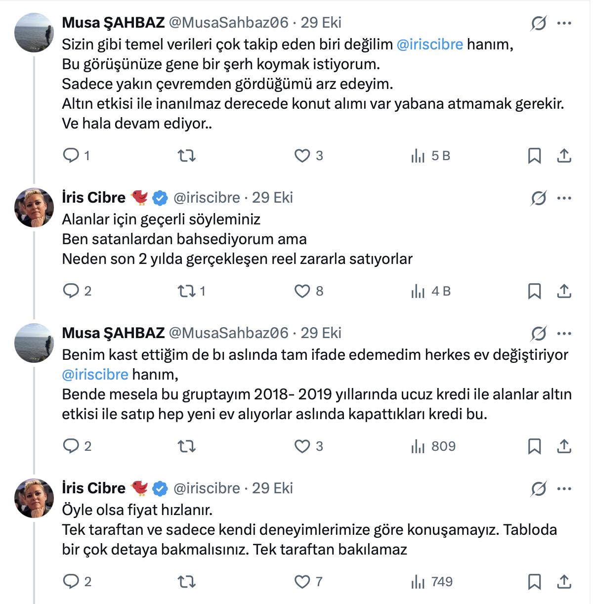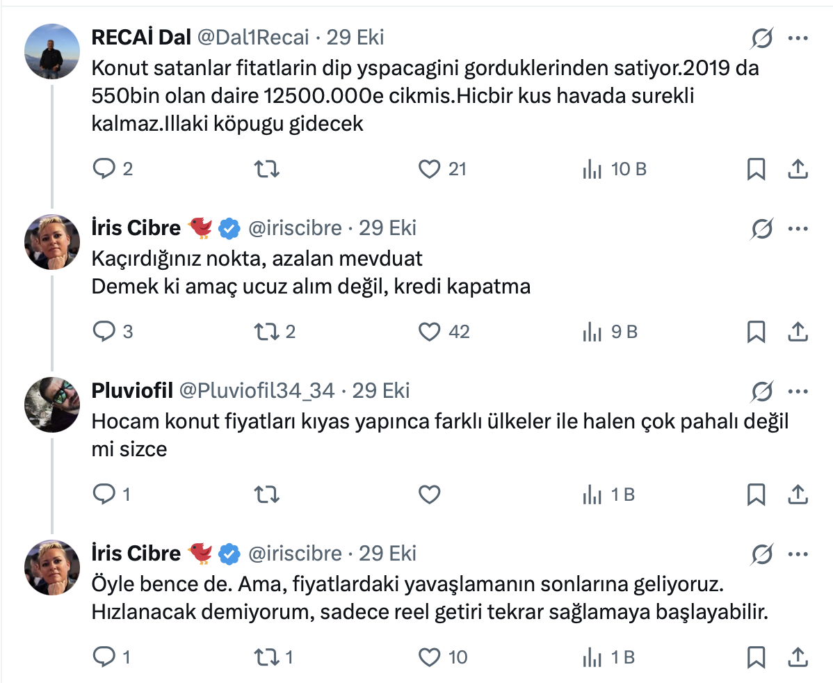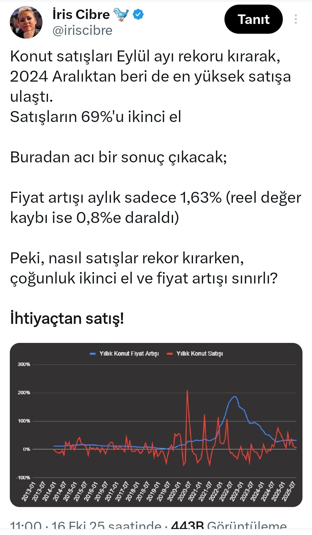 Ekonomist İris Cibre resmi X hesabı üzerinden yaptığı paylaşımda konut satanların kredi kapattığını belirtti.