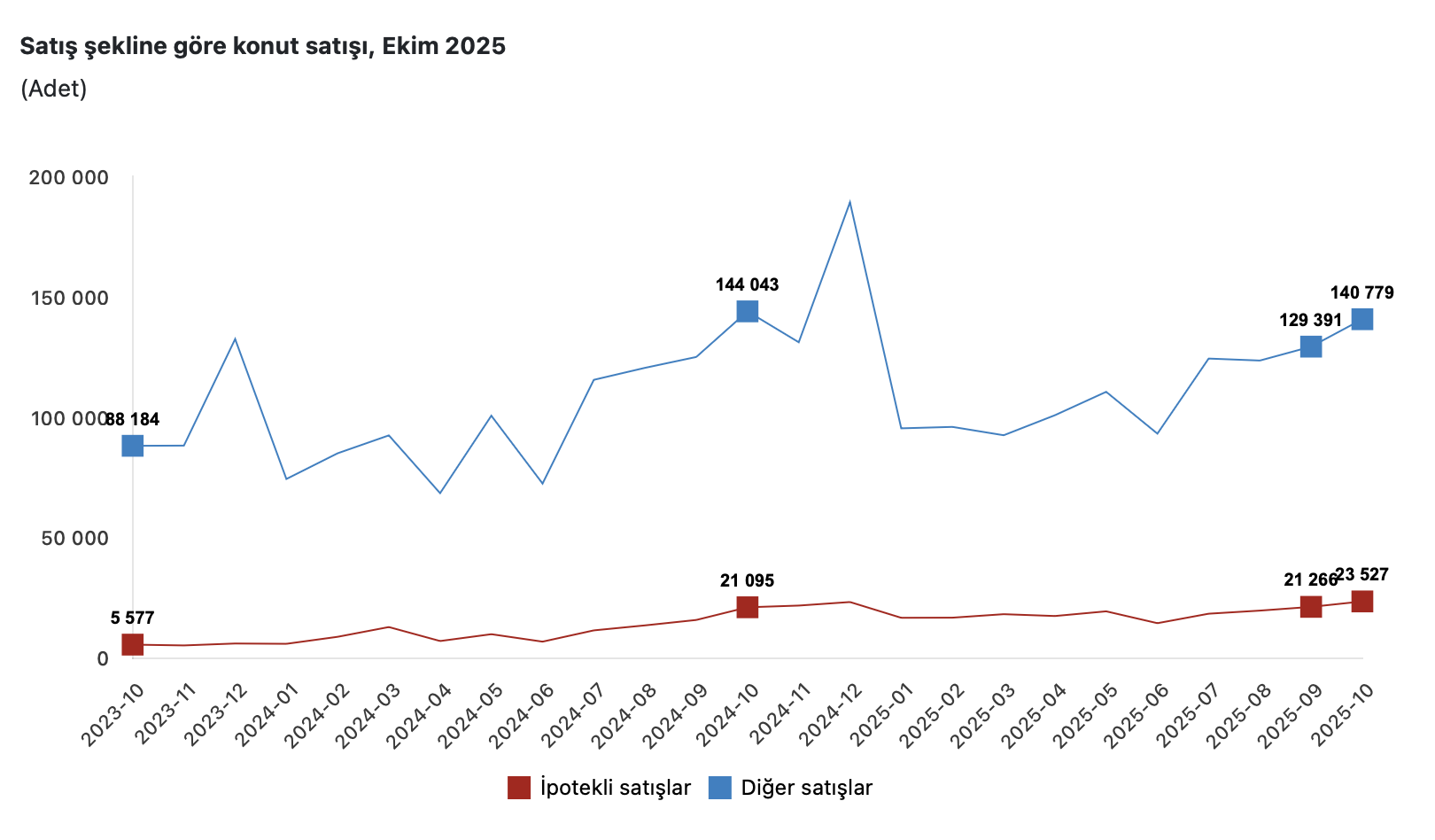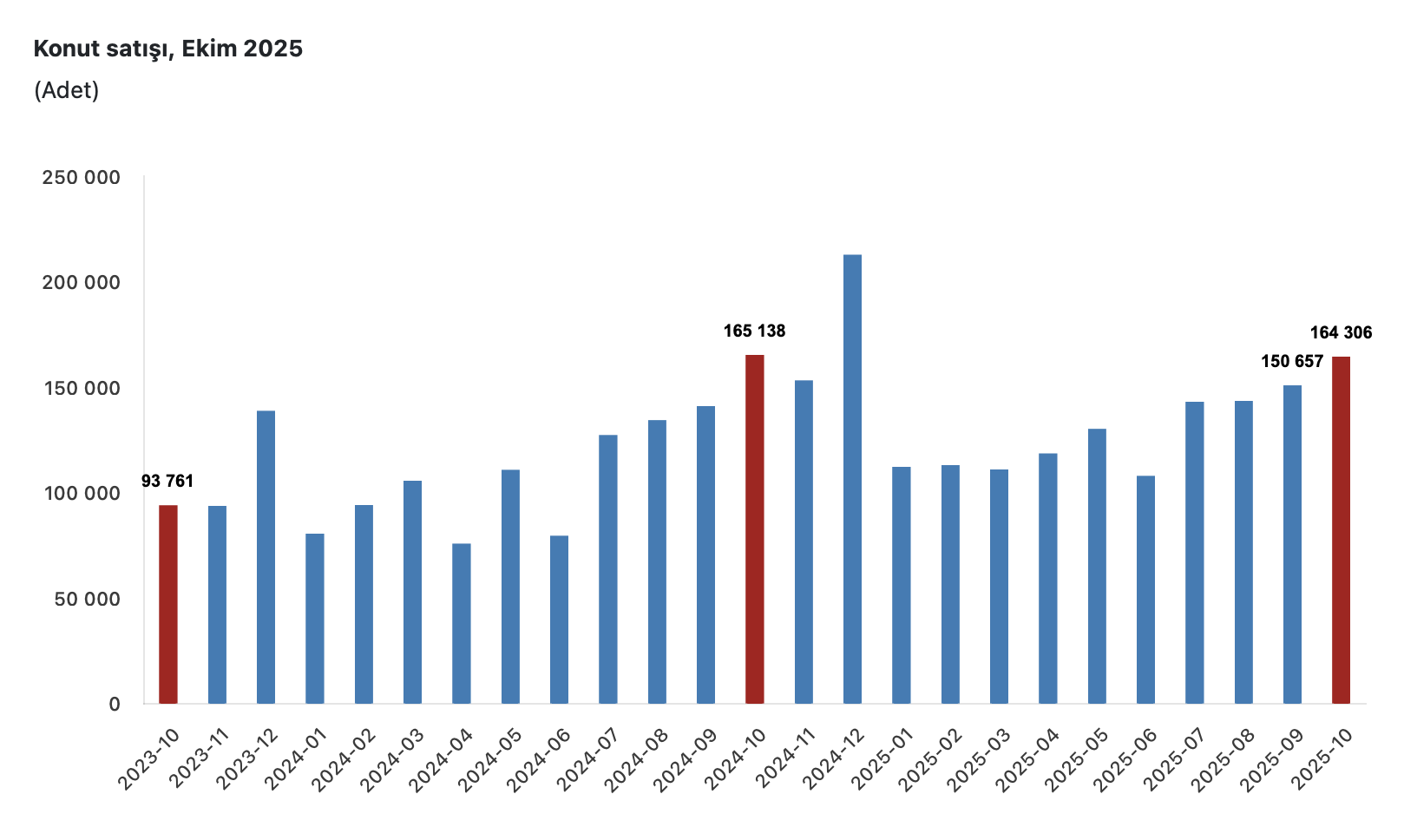 Türkiye İstatistik Kurumu tarafından açıklanan konut satış rakamlarına göreTürkiye genelinde konut satışları Ekim ayında bir önceki senenin aynı ayına göre %0,5 oranında azalarak 164 bin 306 oldu.