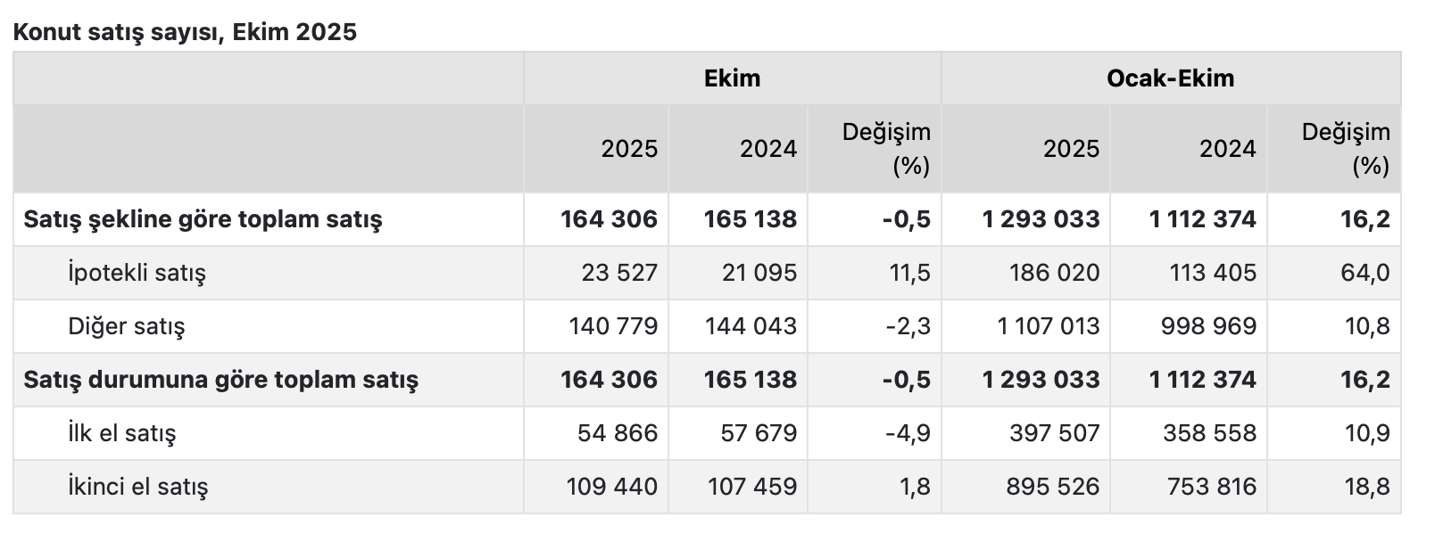 TÜİK tarafından açıklanan rakamlara göre Türkiye genelinde konut satışları Ekim ayında bir önceki senenin aynı ayına göre yüzde 0,5 oranında azaldı ve 164 bin 306 oldu.