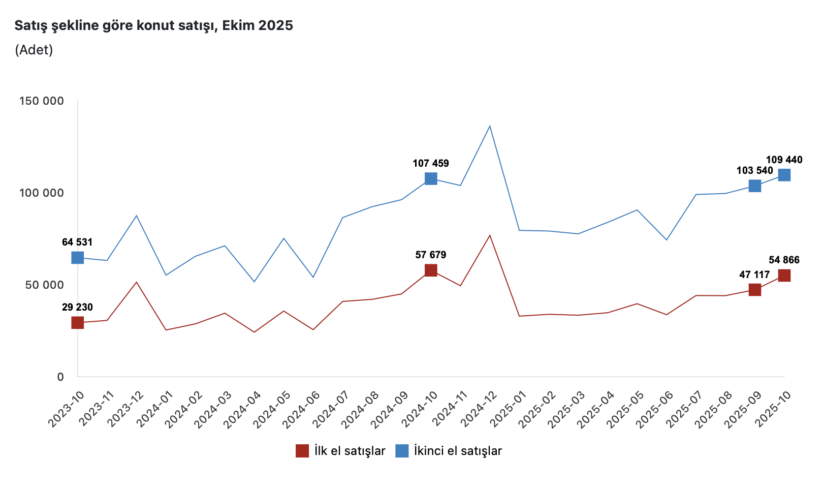 Söz konusu rakamlara göre Türkiye genelinde ilk el konut satış sayısı Ekim ayında bir önceki senenin aynı ayına göre yüzde 4,9 oranında azaldı ve 54 bin 866 oldu. Toplam konut satışları içinde ilk el konut satışının payı yüzde 33,4 şeklinde oldu. İlk el konut satışları Ocak-Ekim döneminde de bir önceki senenin aynı dönemine göre %10,9 oranında arttı ve 397 bin 507 şeklinde gerçekleşti.