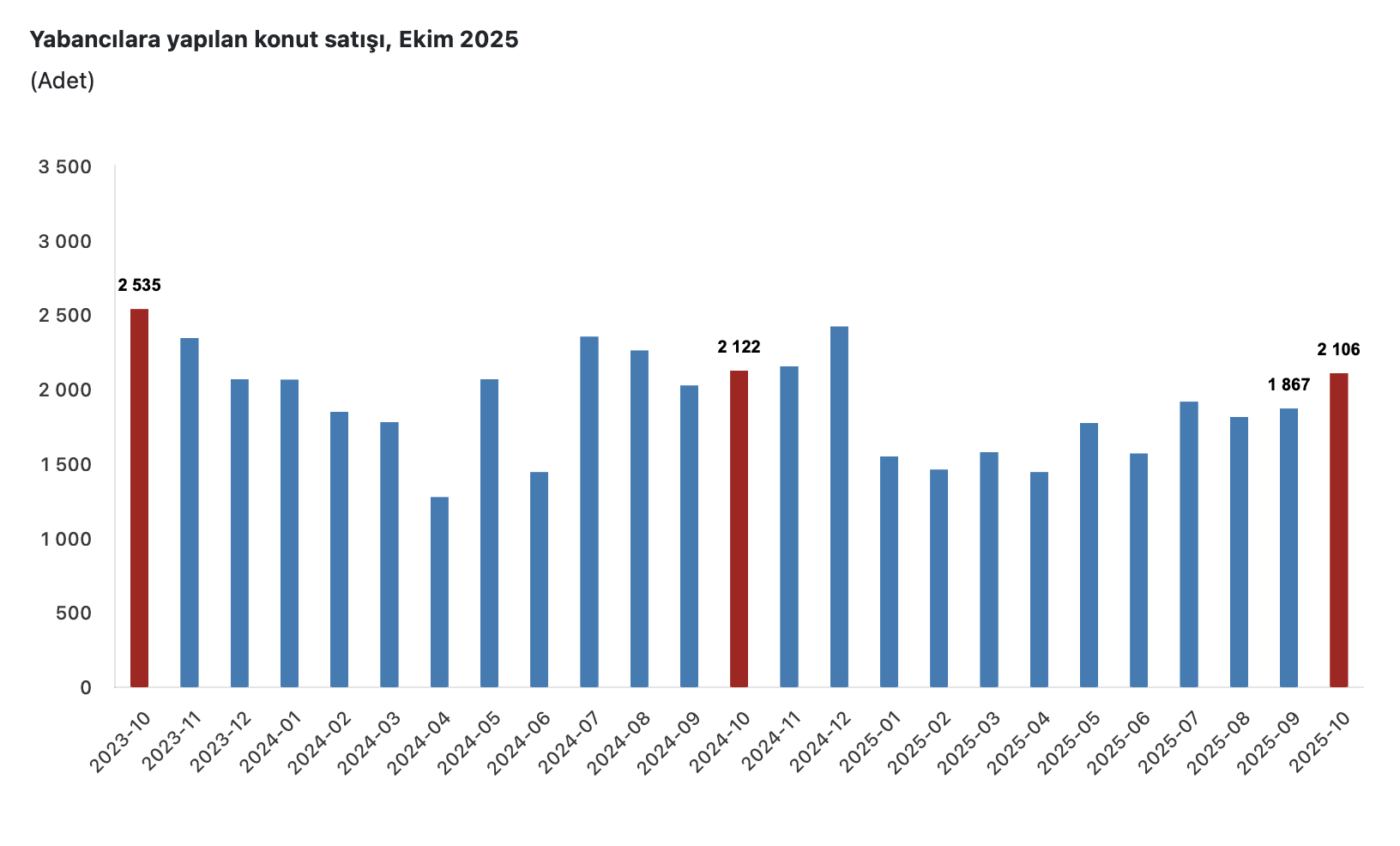 Açıklanan rakamlara göre yabancılara gerçekleştirilen konut satışları Ocak-Ekim döneminde bir önceki senenin aynı dönemine göre yüzde 11,3 oranında azaldı ve 17 bin 50 oldu.