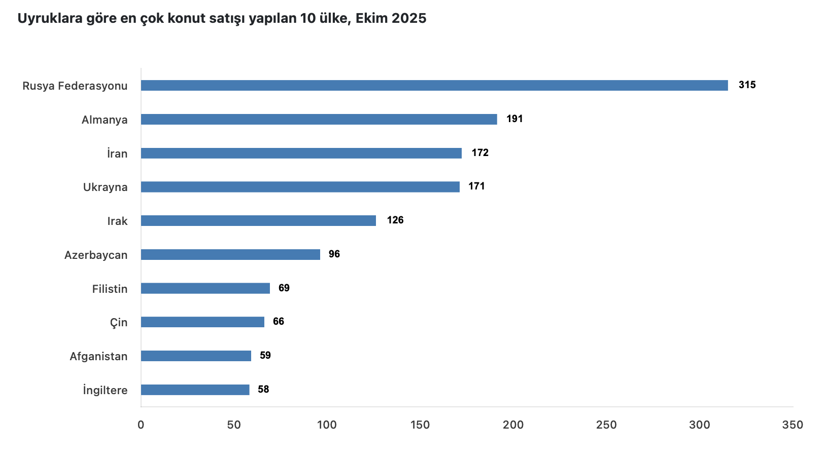 Ekim’de ülke uyruklarına göre en fazla konut satışı sırasıyla 315 ile Rusya Federasyonu, 191 ile Almanya ve 172 ile İran vatandaşlarına gerçekleştirildi.