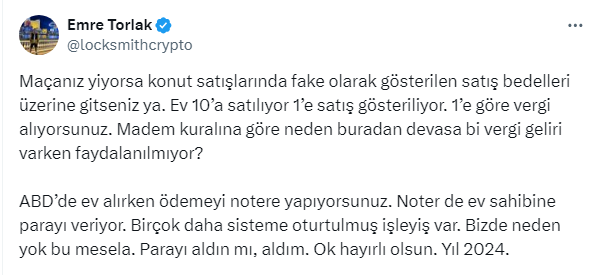 Sıkça uygulanan bu yönteme dikkat çeken Altcoin Trader Kurucusu Emre Torlak, https://twitter.com/locksmithcrypto X sosyal medya hesabından yaptığı paylaşımda, konut satış bedellerinin gerçek gösterilmemesinin üzerine gidilmesi gerektiğini söyledi. Böyle bir vergi gelirinden neden faydalanılmadığını soran Torlak, şu paylaşımı yaptı.
