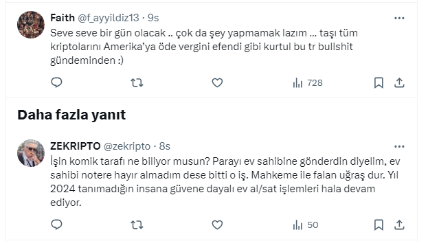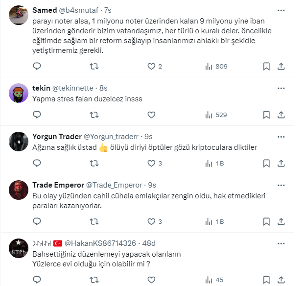 Zamanında Cumhurbaşkanlığı iletişim ofisine gittik regulasyon, vergi vs konuşmak için. Birçok arkadaş daha gitti. Kaç yıl geçti hala elle tutulur bir şey yok. Olsa bile kriptodan elde edilecek vergi kalemi mi daha büyük yoksa konuttan mı? Elbet konu harici birçok kalem daha var. Yapıyorsan yap yapmıyorsan yapma. Sürekli yok işlem vergisi yok stopaj vergisi. Milleti bu gündemle milyon kere meşgul etmeyin artık.”