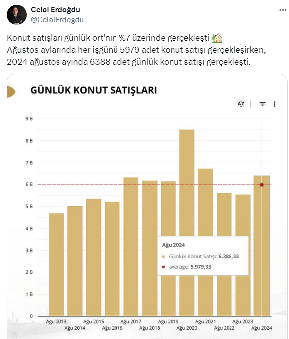 Ağustos aylarında her işgünü 5979 adet konut satışı gerçekleşirken, 2024 ağustos ayında 6388 adet günlük konut satışı gerçekleşti.