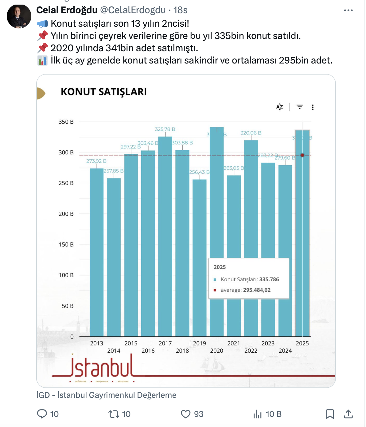 Şehir plancısı, gayrimenkul değerleme uzmanı Celal Erdoğdu resmi sosyal medya hesabı üzerinden yaptığı paylaşımda konut satışlarının son 13 yılın 2.’si olduğunu belirtti.