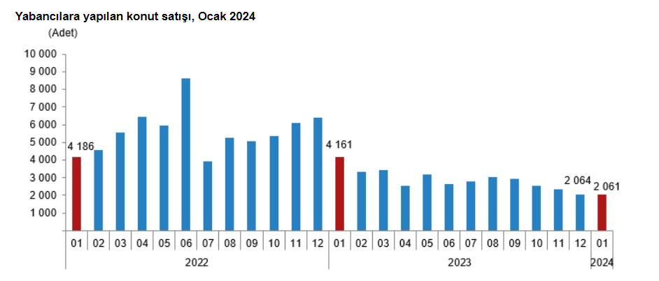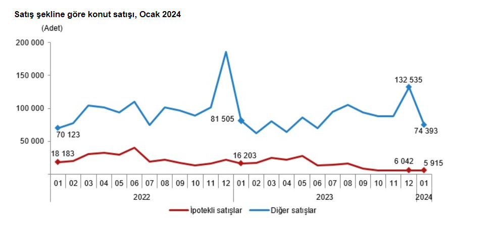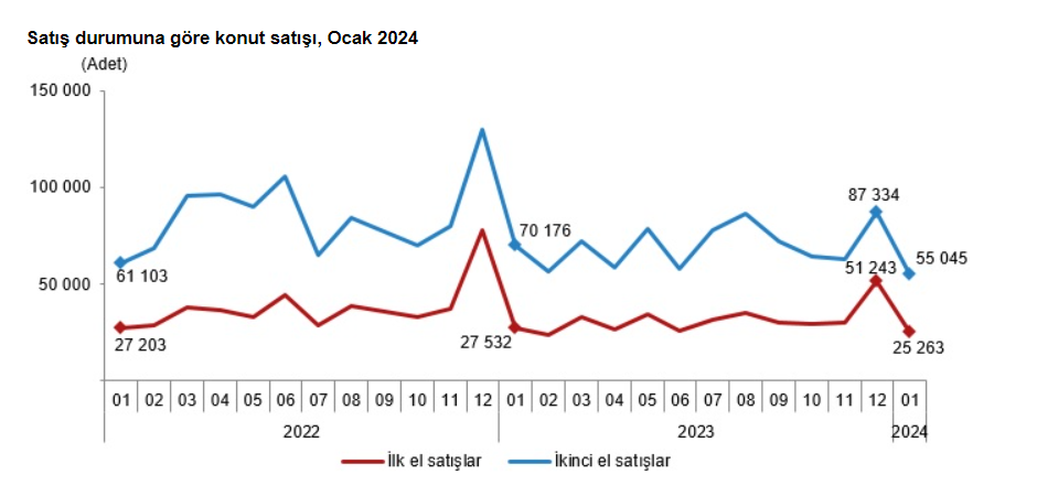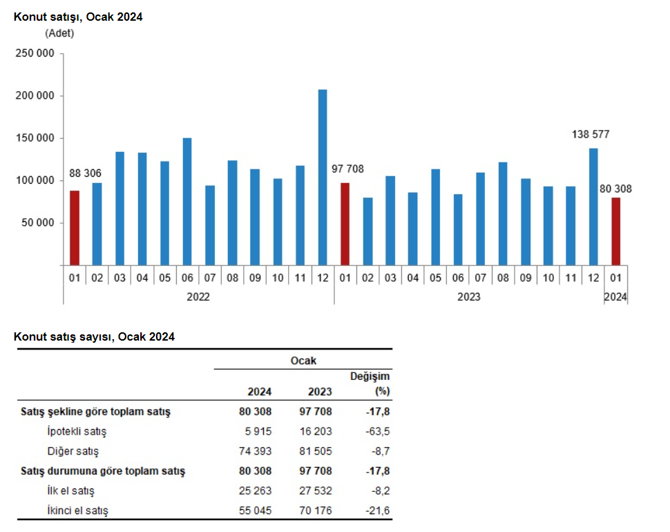 Türkiye İstatistik Kurumu (TÜİK) tarafından açıklanan rakamlara göre Türkiye genelinde konut satışları 2024 yılının Ocak ayında bir önceki senenin aynı ayına göre yüzde 17,8 azaldı ve 80 bin 308 şeklinde oldu. Konut satışlarında İstanbul 13 bin 423 konut satışı ve yüzde 16,7 ile en yüksek paya sahip oldu. Resmi olarak açıklanan satış sayılarına göre İstanbul'u 6 bin 709 konut satışı ve yüzde 8,4 pay ile başkent Ankara, 5 bin 250 konut satışı ve yüzde 6,5 pay ile Antalya takip etti. Konut satış sayısının en az olduğu şehirler sırasıyla 17 konut ile Ardahan, 38 konut ile Hakkari ve 40 konut ile Bayburt şeklinde oldu.