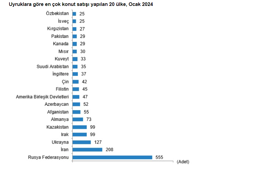 2024 yılının Ocak ayında Rusya Federasyonu vatandaşları Türkiye'den 555 konut aldı. Rusya Federasyonu vatandaşlarını sırasıyla 208 konut ile İran, 127 konut ile Ukrayna, 99 konut ile Irak ve Kazakistan vatandaşları takip etti.
