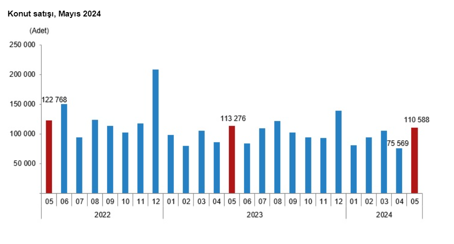 Türkiye İstatistik Kurumu tarafından açıklanan rakamlara göre Türkiye genelinde konut satışları Mayıs'ta bir önceki senenin aynı ayına göre yüzde 2,4 azaldı ve 110 bin 588 oldu. Konut satış sayısının en fazla olduğu şehirler sırasıyla 18 bin 814 ile İstanbul, 9 bin 861 ile Ankara ve 6 bin 306 ile Antalya olurken, en az olduğu şehirler sırasıyla 37 ile Bayburt, 46 ile Ardahan ve 60 ile Hakkari şeklinde oldu.