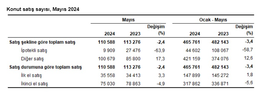 Konut satışları yüzde 2,4 azaldı! 2024 Mayıs'ta 110 bin 588 konut satıldı!