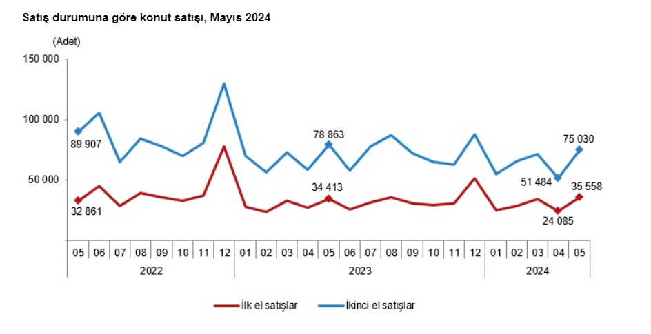 TÜİK'in açıkladığı rakamlara göre Türkiye genelinde ilk el konut satış sayısı Mayıs'ta bir önceki senenin aynı ayına göre yüzde 3,3 artış göstererek, 35 bin 558 şeklinde oldu. Toplam konut satışları içinde ilk el konut satışının payı yüzde 32,2 oldu. İlk el konut satışları Ocak-Mayıs döneminde ise bir önceki senenin aynı dönemine göre yüzde 1,8 artışla 147 bin 899 şeklinde gerçekleşti.