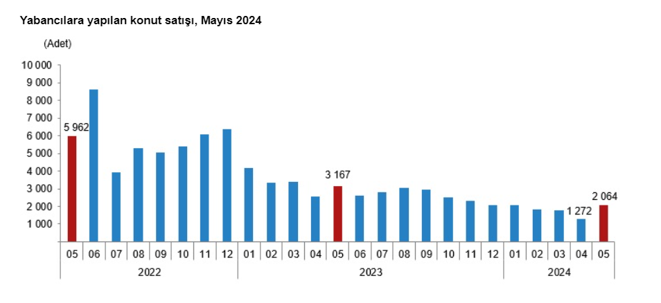 Yabancılara gerçekleştirilen konut satışları Mayıs'ta bir önceki senenin aynı ayına göre yüzde 34,8 azaldı ve 2 bin 64 şeklinde oldu. Mayıs'ta toplam konut satışları içinde yabancılara gerçekleştirilen konut satışının payı yüzde 1,9 şeklinde gerçekleşti. Yabancılara gerçekleştirilen konut satış sayısının en fazla olduğu iller sırasıyla 797 ile Antalya, 668 ile İstanbul ve 164 ile Mersin şeklinde oldu.