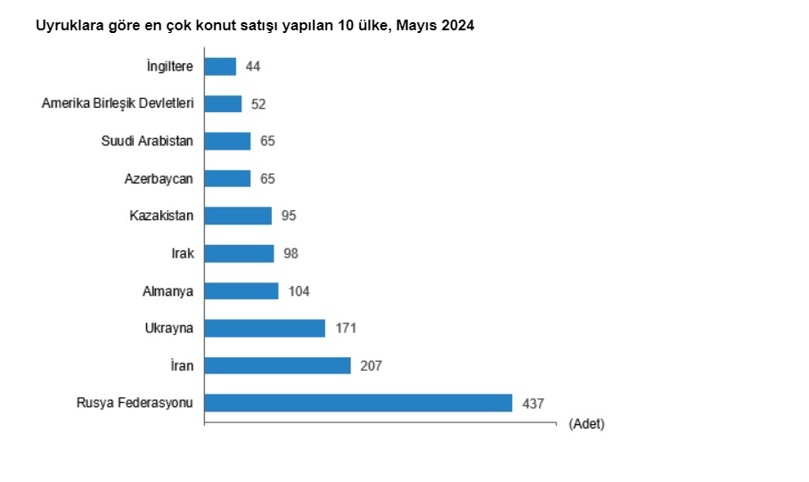 Ülke uyruklarına göre en çok konut satışı Rusya Federasyonu vatandaşlarına yapılırken Mayıs'ta ülke uyruklarına göre en fazla konut satışı sırasıyla 437 ile Rusya Federasyonu, 207 ile İran ve 171 ile Ukrayna vatandaşlarına yapıldı.
