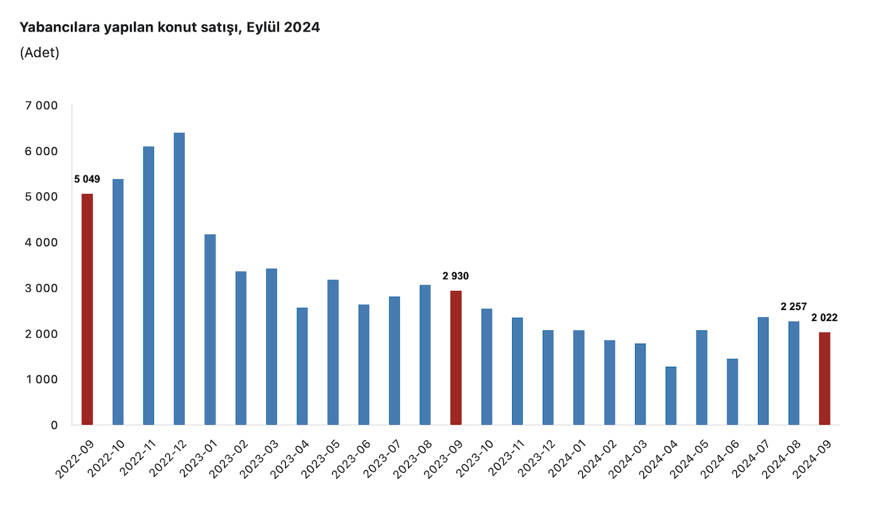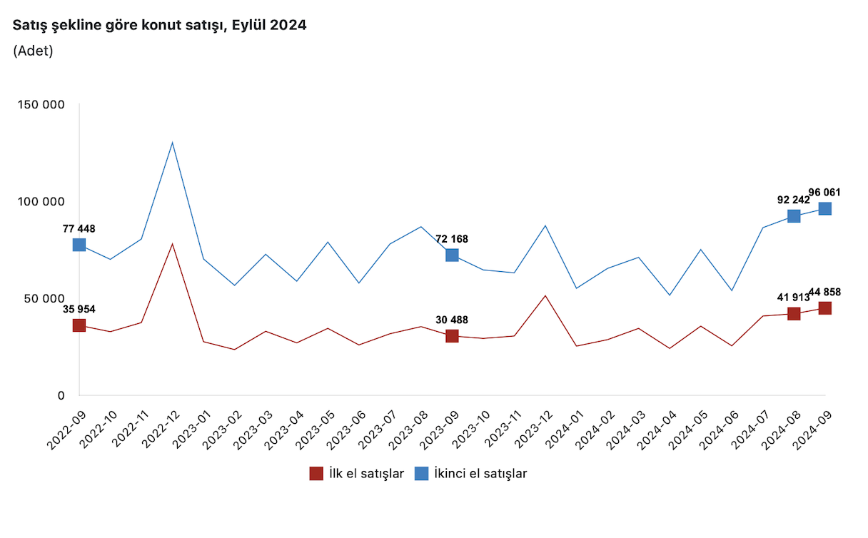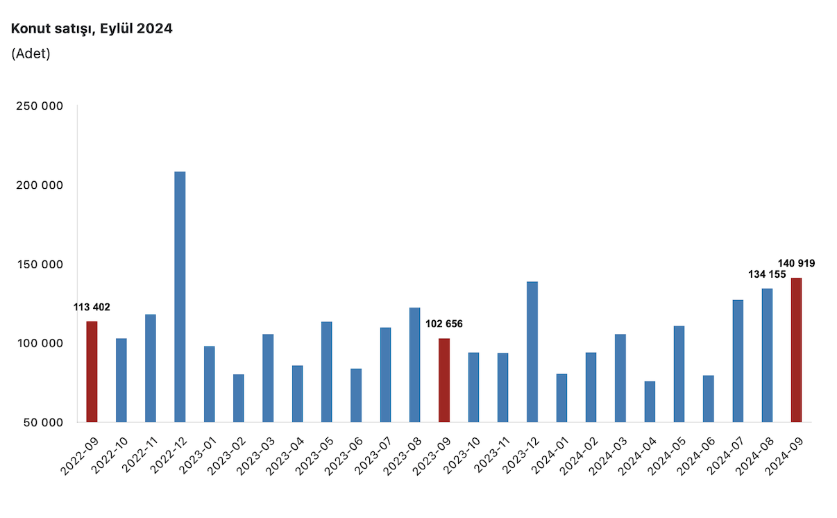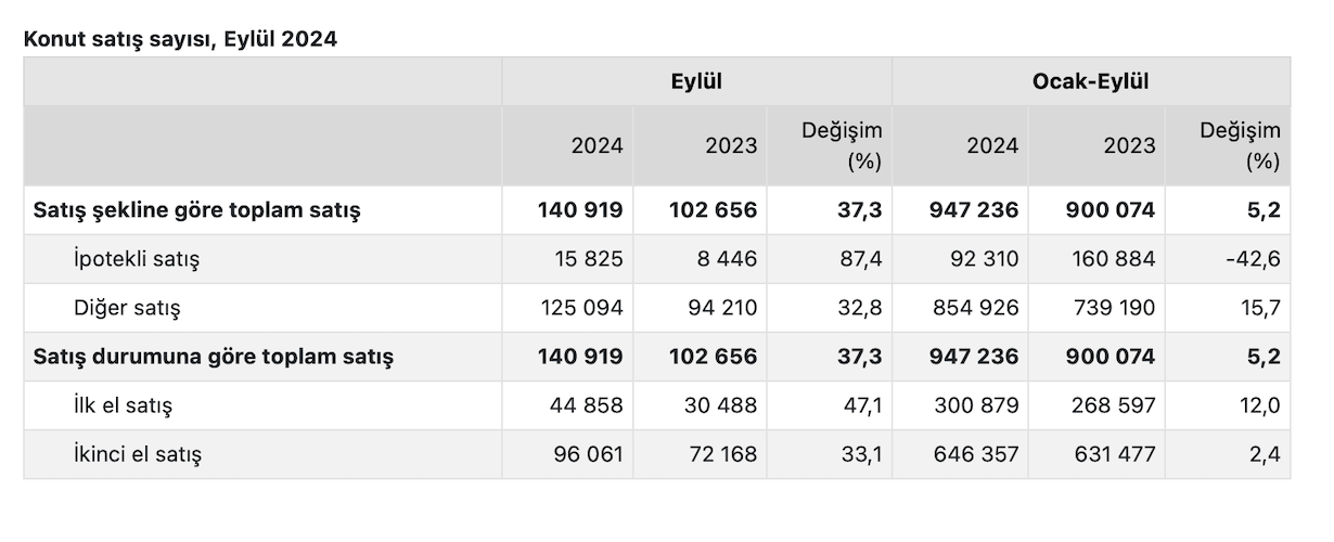 Türkiye İstatistik Kurumu tarafından açıklanan rakamlara göre Türkiye genelinde konut satışları 2024 yılının Eylül ayında bir önceki yılın aynı ayına göre yüzde 37,3 oranında artarak 140 bin 919 oldu. Konut satış sayısının en fazla olduğu şehirler sırasıyla 21 bin 314 ile İstanbul, 13 bin 205 ile Ankara ve 7 bin 612 ile İzmir olurken, en az olduğu iller sırasıyla 74 ile Hakkari, 82 ile Ardahan ve 106 ile Bayburt şeklinde gerçekleşti.