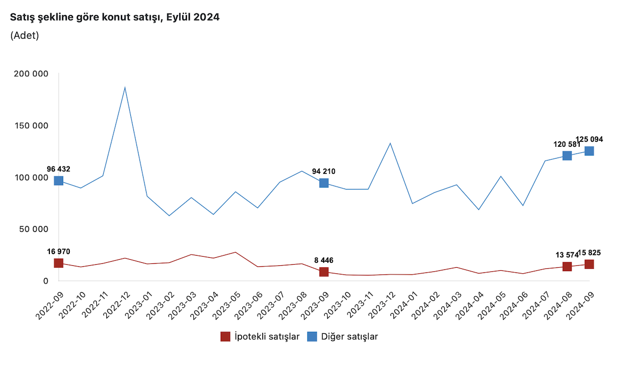 TÜİK’in açıkladığı rakamlara göre ülke genelinde diğer konut satışları Eylül ayında bir önceki senenin aynı ayına göre yüzde 32,8 oranında arttı ve 125 bin 94 oldu. Toplam konut satışları içinde diğer satışların payı yüzde 88,8 şeklinde gerçekleşti. Ocak-Eylül döneminde gerçekleşen diğer konut satışları ise bir önceki senenin aynı dönemine göre yüzde 15,7 oranında arttı ve 854 bin 926 oldu.