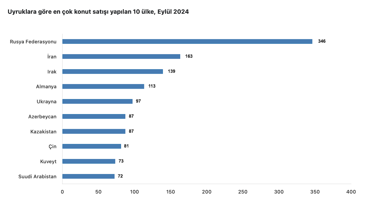 Eylül’de ülke uyruklarına göre en fazla konut satışı sırasıyla 346 ile Rusya Federasyonu, 163 ile İran ve 139 ile Irak vatandaşlarına gerçekleştirildi.