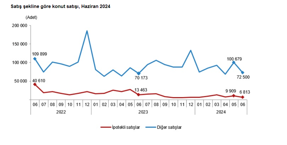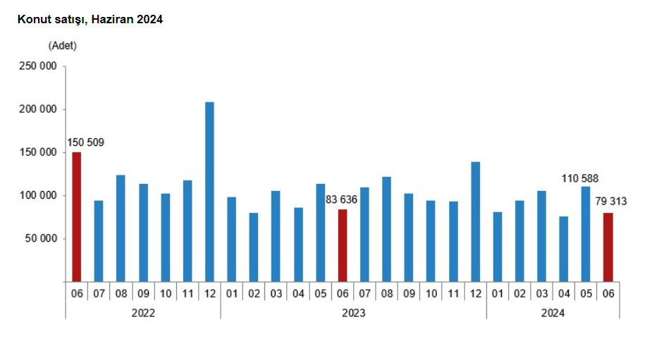 Türkiye İstatistik Kurumu tarafından açıklanan rakamlara göre Türkiye genelinde konut satışları Haziran'da bir önceki senenin aynı ayına göre yüzde 5,2 azaldı ve 79 bin 313 oldu. Konut satış sayısının en fazla olduğu şehirler sırasıyla 13 bin 25 ile İstanbul, 6 bin 866 ile Ankara ve 4 bin 361 ile İzmir olurken, en az olduğu şehirler sırasıyla 34 ile Ardahan, 40 ile Hakkari, 44 ile Tunceli ve Bayburt şeklinde oldu.