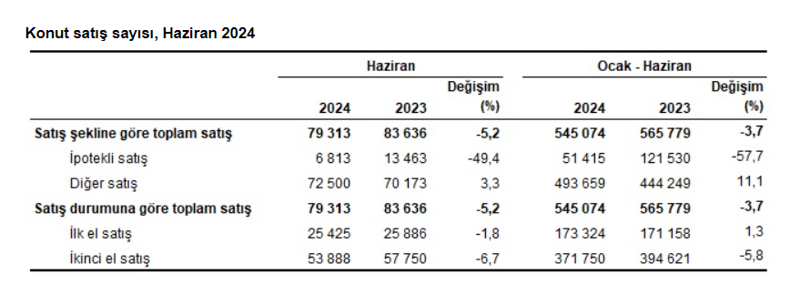 TÜİK tarafından açıklanan rakamlara göre konut satışları Ocak-Haziran döneminde bir önceki senenin aynı dönemine göre yüzde 3,7 azalışla 545 bin 74 şeklinde gerçekleşti.