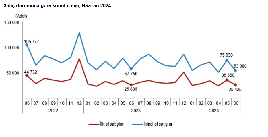 TÜİK'in açıkladığı rakamlara göre Türkiye genelinde ilk el konut satış sayısı Haziran'da bir önceki senenin aynı ayına göre yüzde 1,8 azaldı ve 25 bin 425 oldu. Toplam konut satışları içerisinde ilk el konut satışının payı yüzde 32,1 şeklinde oldu. İlk el konut satışları Ocak-Haziran döneminde ise bir önceki yılın aynı dönemine göre yüzde 1,3 artış göstererek 173 bin 324 olarak gerçekleşti.